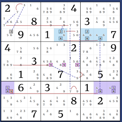 Yes this took way longer than I expected. Not sure if I can keep these up every week, we'll see how long my motivation lasts. Still not sure how valid these AIC DoF extensions I've been trying out are, you could make an argument that they're still using forcing logic, but the chains have no memory and their graphs are still made of alternating strong links & weak inferences which will always lead you to a shared conclusion (the elimination). One thing is for sure, these constructs are very powerful, and classical two-ended AIC will never be able to solve a puzzle this difficult :D